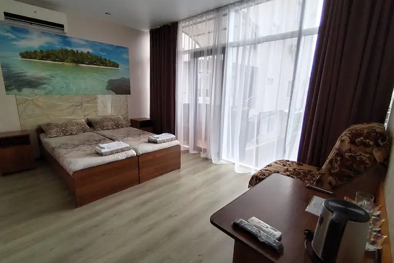 Отдыхали в «Марии» во второй половине июня 2023 года. Нам всё очень понравилось. Жили на втором этаже в четырёхместном двухкомнатном номере. Удобства на 3 номера. Номер большой, свободный, холодильник, два телевизора (20 программ). Бельё чистое, полотенца тоже были, хотя эконом и я думала, что может не будет, и из дома брала. В санузле чисто, даже бумагу туалетную каждый день хозяйка ложила и убирала каждый день рано утром. Хозяйки дома — русские женщины. Мария Иоановна — главная, принимала и расселяла нас. Сначала показалась строгой, но оказалась очень милой женщиной. Её дочь — Татьяна — помогает и подсказывает, если что нужно. В конце отдыха моя дочка вообще решила у них остаться жить) Уезжали со слезами на глазах, так хотелось остаться ещё. Сам дом расположен в самом центре курортного городка. Точек общепита кругом много. Мы питались в Щи-борщи или в Солнышке. Рядом столовка Ложка-Вилка — не понравилось совсем — не вкусно и дорого. Напротив дома самая вкусная картошка фри, курица гриль и шаурма. Пляж рядом. Все развлечения там есть. Многие писали, что в курортном городке — сплошной ротовирус. Очень боялась. Но, всё прошло хорошо, главное не есть всякую гадость с улицы — сладости разные, чурчхелу, булочки и т. д. В целом, выбором места проживания я осталась довольна, как слон и очень надеюсь, что мы приедем туда снова в 2025 году. Хозяюшкам большое спасибо за заботу о своих отдыхающих!