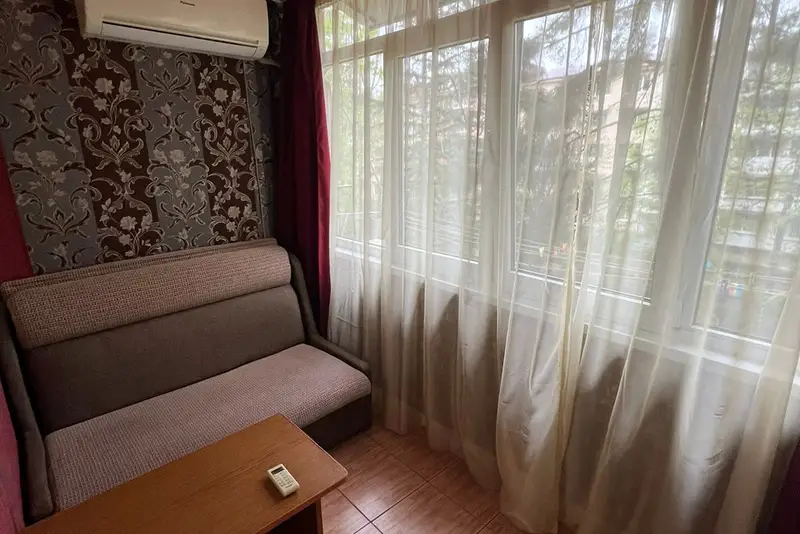 Однокомнатная квартира с жилой лоджией. Центр Адлера. Микрорайон «Черемушки». Панельная пятиэтажка. Третий этаж. Перед домом парковка и тенистая детская площадка.