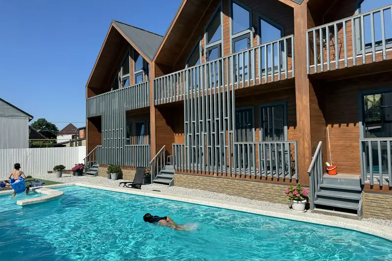 Стационарный бассейн с подогревом и детской зоной, также на территории мангальная зона и автостоянка.