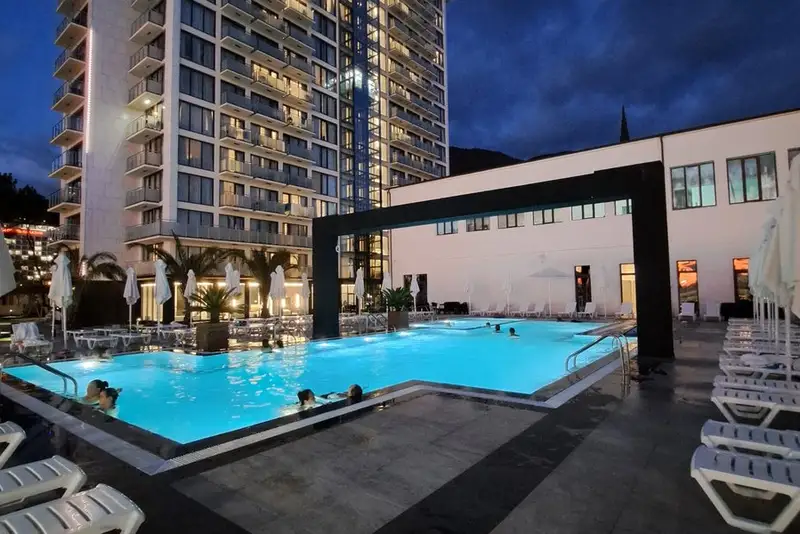 Новое 16-ти этажное здание отеля, оснащенное лифтами, возвышается прямо на Черноморском побережье.