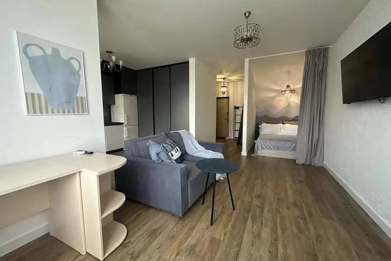 Уютная квартира-студия расположена в небольшом многоквартирном доме, в тихом районе. У вас не будет ощущения, что вы проживаете в «человейнике». Вместе с тем вся необходимая инфраструктура расположена в шаговой доступности.