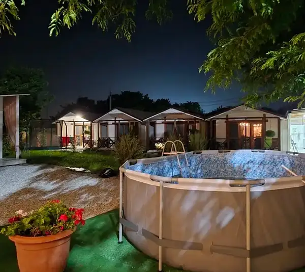 • В домиках есть все необходимое для комфортного проживания: санузел, кондиционер, холодильник, тв, wi-fi, удобная мебель и премиальное постельное белье. На террасах перед домиками есть садовая мебель для отдыха на свежем воздухе. Для гостей доступна летняя кухня.