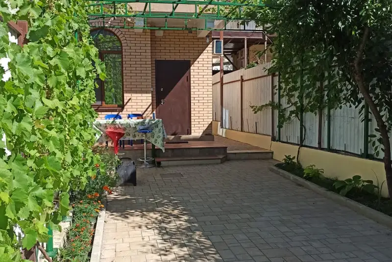 На каждом этаже по две комнаты-студии со своей кухонкой и санузлом. На втором этаже одна комната с балконом, другая с лоджией. Зелёный двор, увитый виноградом, с местом для отдыха и мангалом. В одной из комнат стиральная машинка.