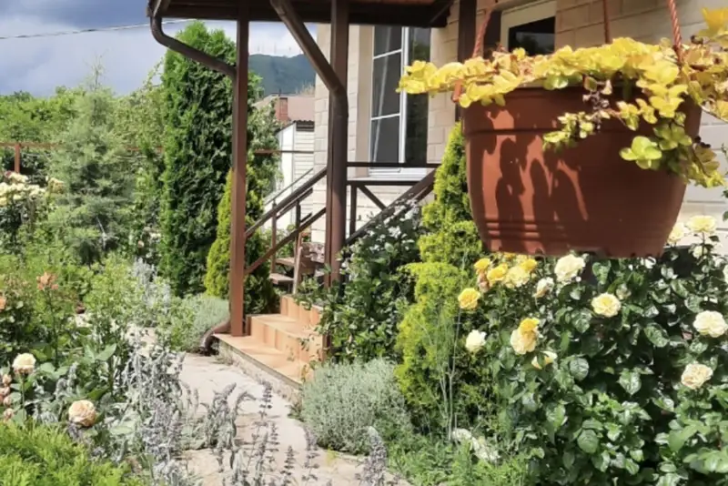 Территория Гостевого Дома «Белого какаду» утопает в зелени туй, редких пород хвойников, в разнообразии цветов.