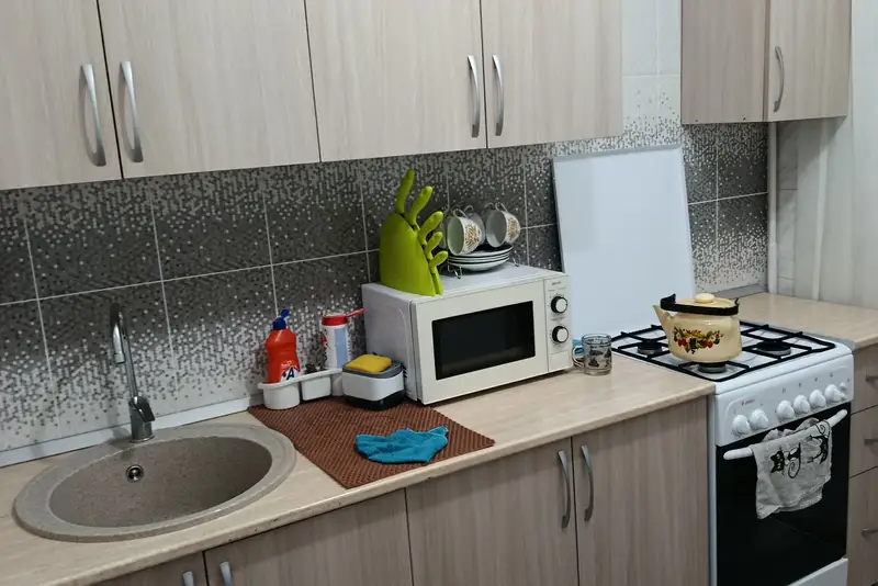 В квартире для проживания есть всё необходимое из мебели и техники в отличном состоянии: два дивана, кондиционер, холодильник, микроволновка, плита, посуда, кастрюли, сковородки, утюг.