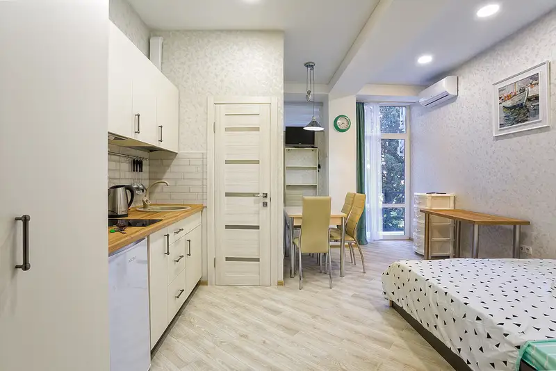 Однокомнатная квартира-студия с балконом на третьем этаже семиэтажного дома. Лестница открытая, лифта нет, поэтому предпочтительно для молодых людей, которые не боятся подъемов и спусков.